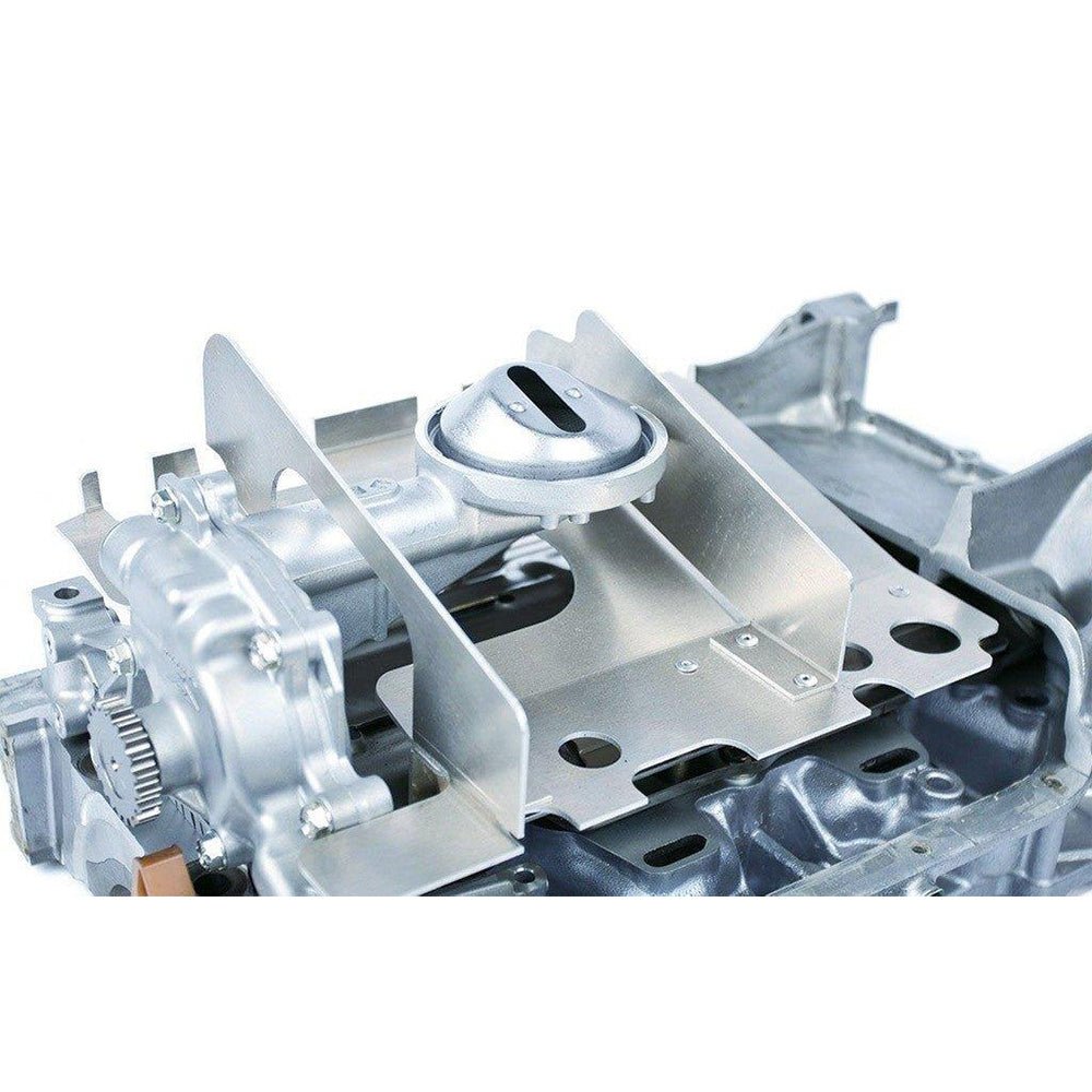 BLOX Racing's Oil Pan Baffle is designed to prevent oil from sloshing inside the pan. The unique design creates three chambers within the pan, with the largest chamber surrounding the oil pump pick-up. This ensures that there is enough oil volume present to prevent oil starvation during hard driving, cornering and other racing conditions. With continuous oil pick-up, critical engine lubrication is maintained and oil starvation prevented.